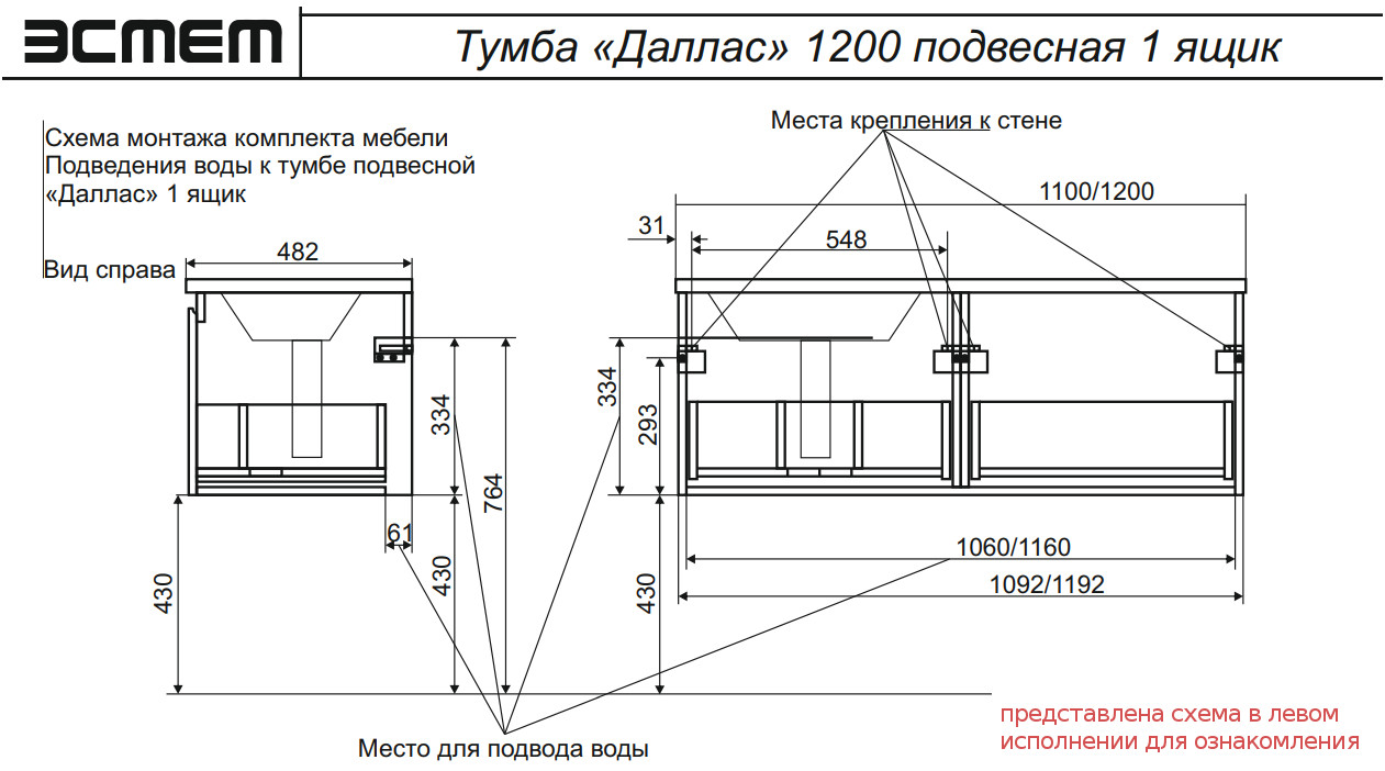 - Тумба с раковиной справа Dallas Luxe 1100 навесная 1 длинный ящик