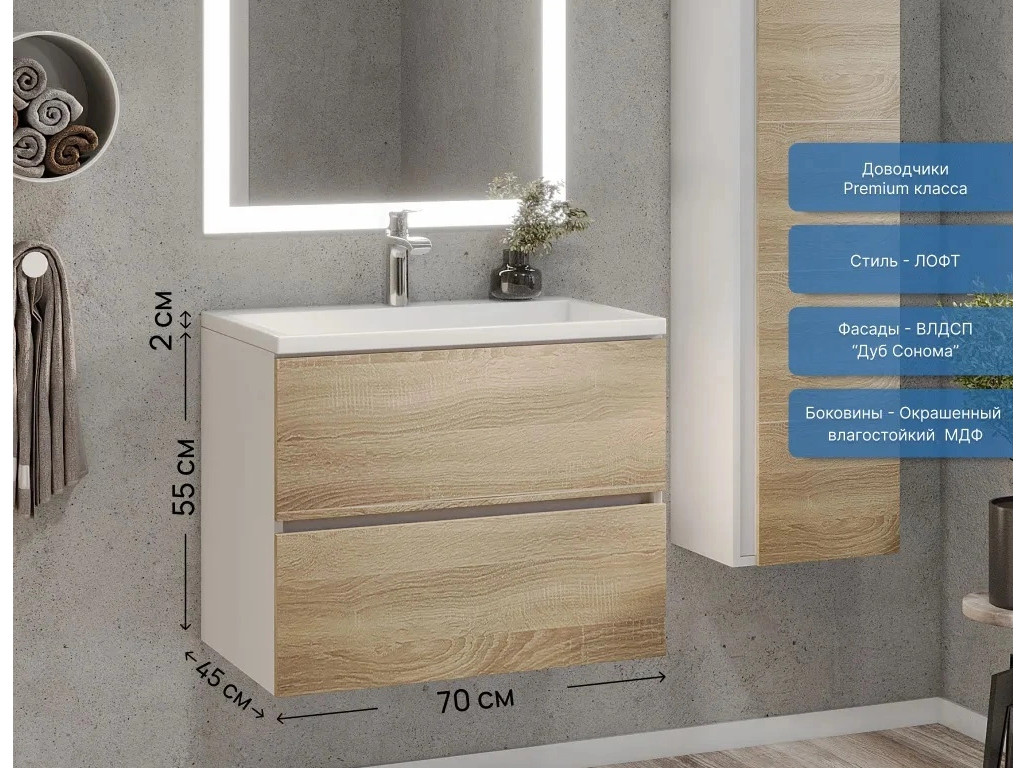 Фасад - ЛДСП в пленке под дерево, цвет дуб сонома. Выдвижные ящики изготовлены из влагостойкой ЛДСП. Ящики оснащены доводчиками. Фурнитура и доводчики премиум класса.