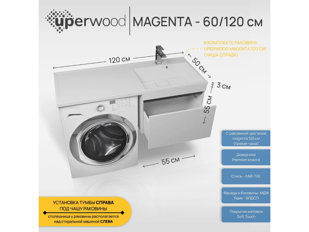 - Тумба с раковиной Uperwood Magenta 60-120 см подвесная белая/графит выдвижной ящик правая