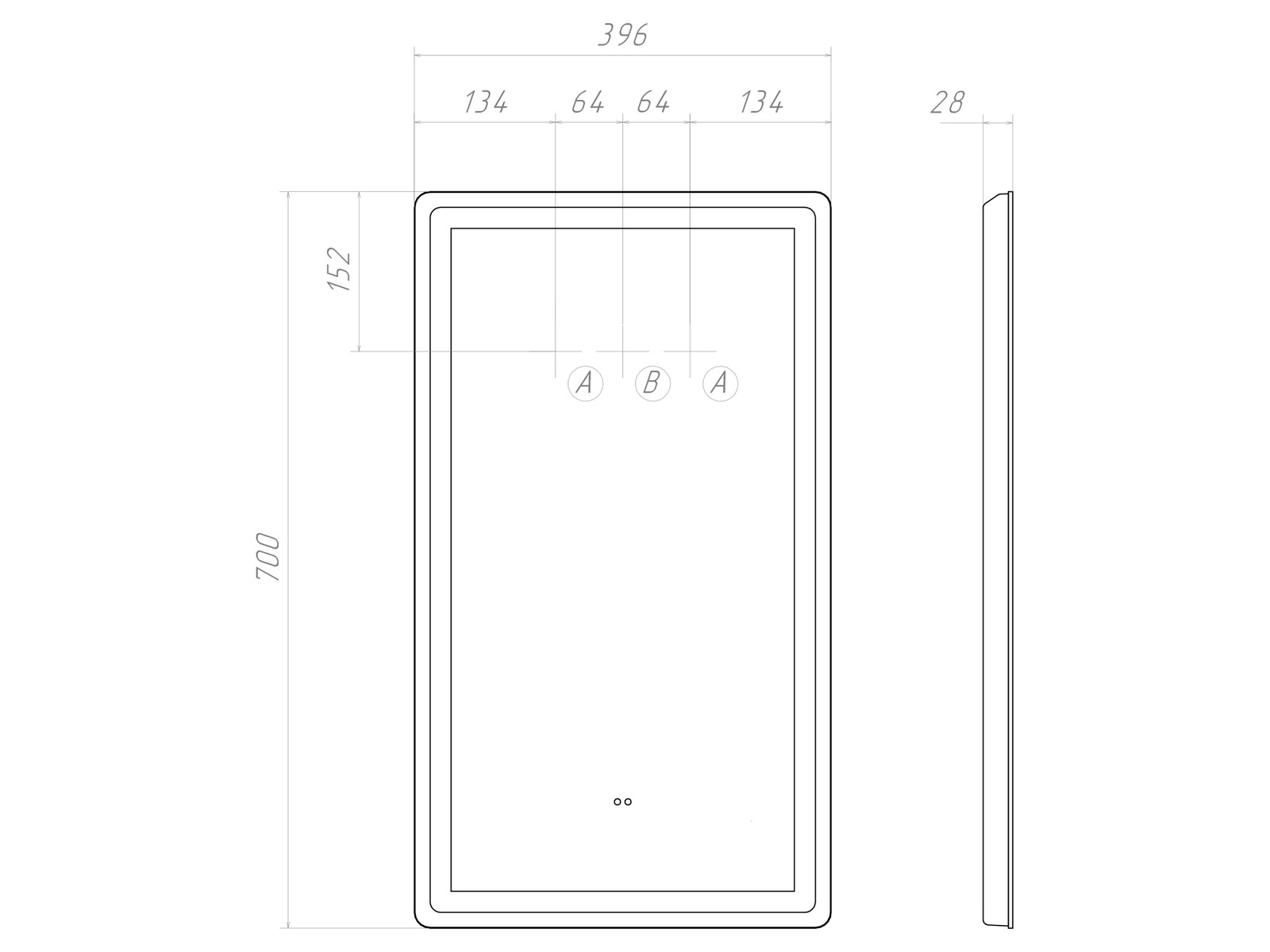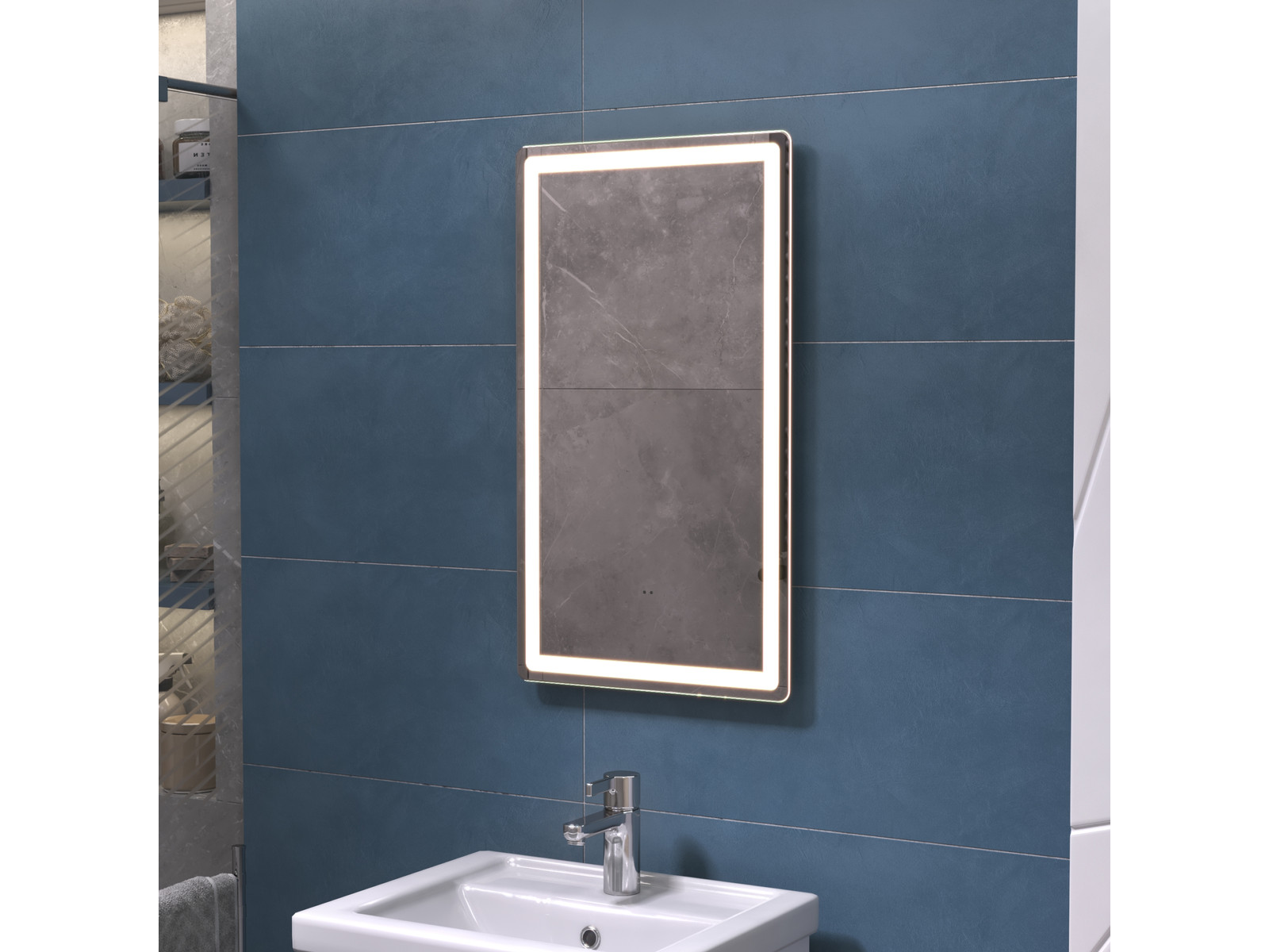 Подсветка фронтальная по периметру, с цветовой температурой 5000К – нейтральный белый, управление подсветкой бесконтактный выключатель «на взмах»