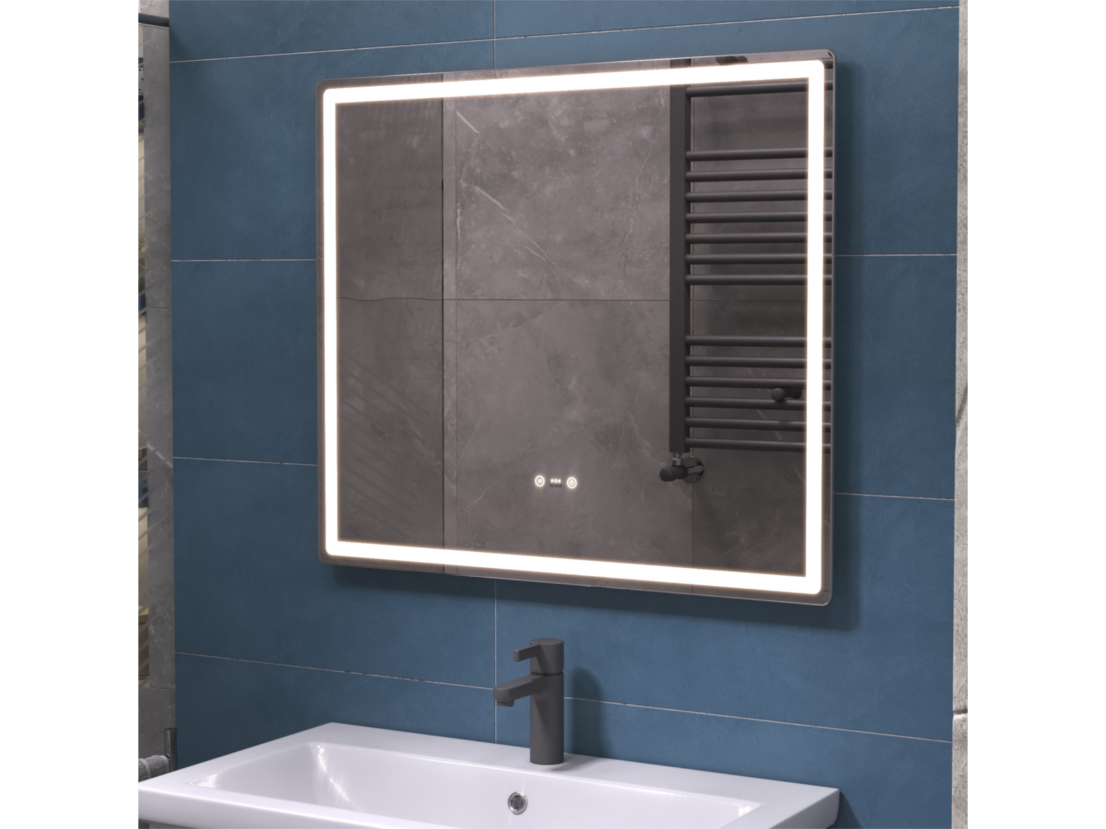 Подсветка фронтальная по периметру, с цветовой температурой 5000К – нейтральный белый, управление подсветкой сенсорное/датчик присутствия (1.5 м.)
