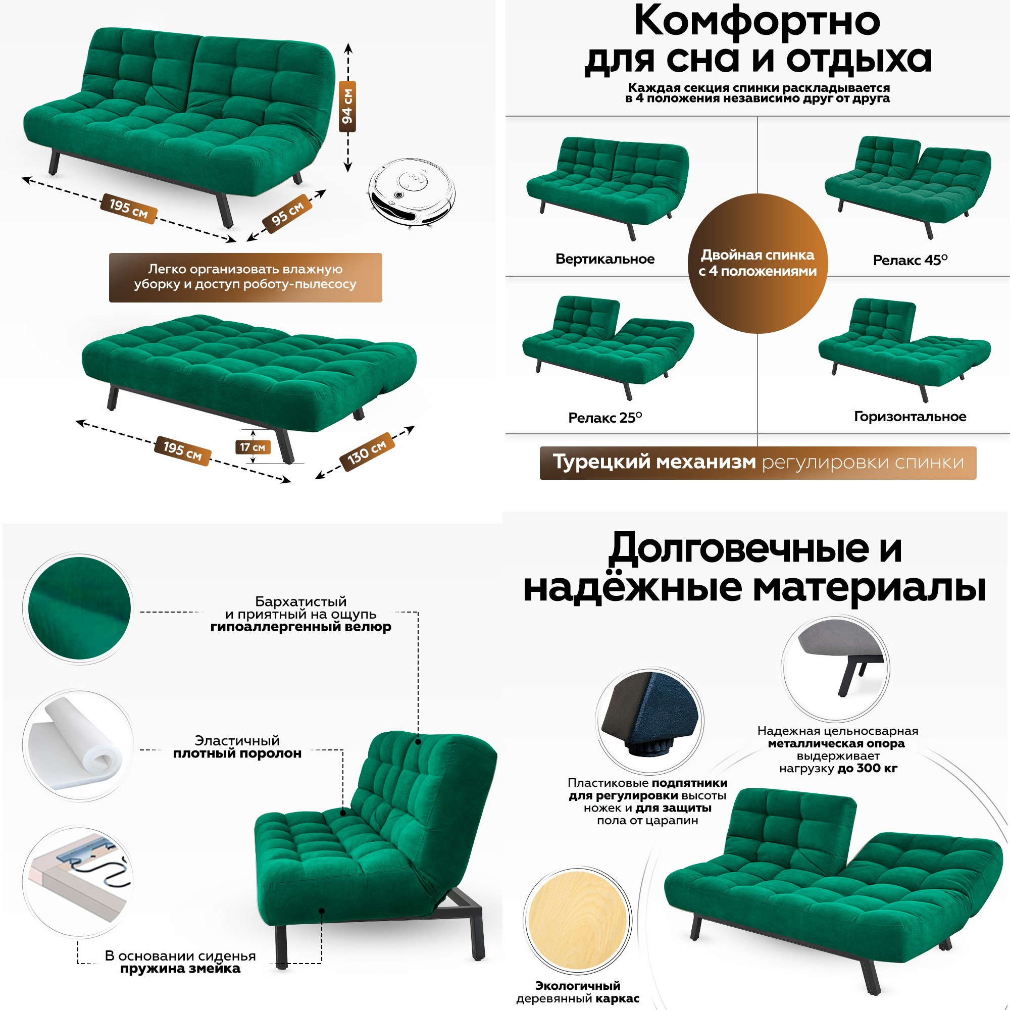 Встроенный механизм «клик кляк» позволяет трансформировать диван в 3 положения: