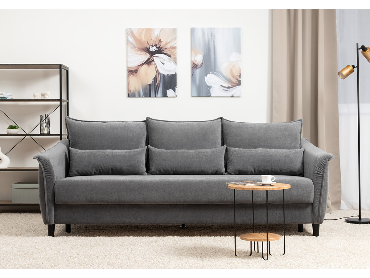 Спинка с тремя приспинными подушками. Две подушки трапецивидной формы, центральная квадратной формы на молнии, по трем сторонам которых проложена отделочная строчка на 1,2 см. По контуру боковин проложен декоративный кант на 1,2 см из основной ткани. Кант проходит по центру передней части боковины, а по внутренней верхней части сборка.