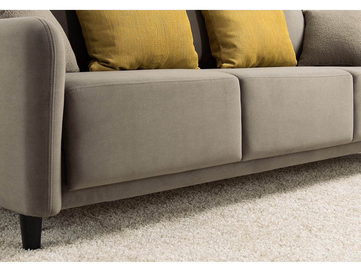 Декор: В комплекте 2 двусторонние декоративные подушки и 2 декоративные думки. Задняя спинка в ткани основы. Декоративные отделочные строчки по боковинам и сиденью
