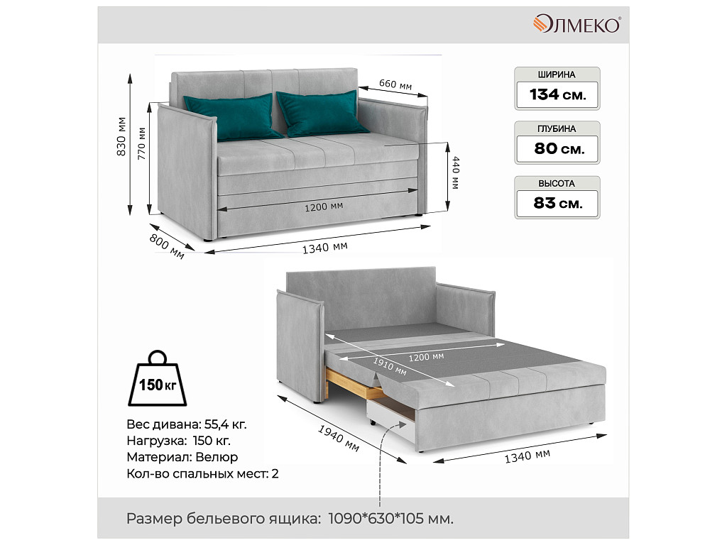 - Разложенный: 770х1340х1940 мм