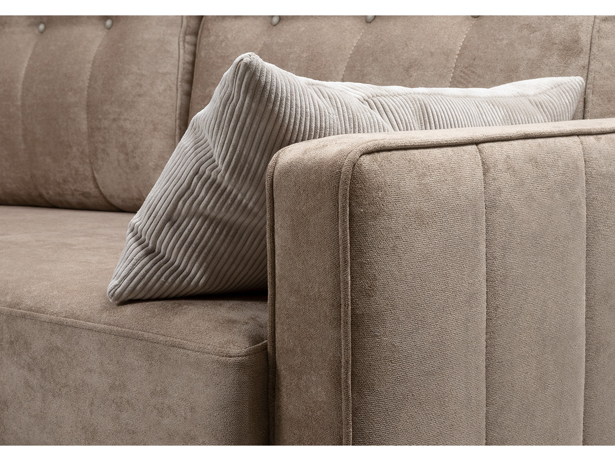 Подушки имеют трапециевидную форму, с утолщением к низу для комфорта посадки. Кант по всему периметру подушек, декоративные утяжки металлическими пуговицами, вертикальная стежка.