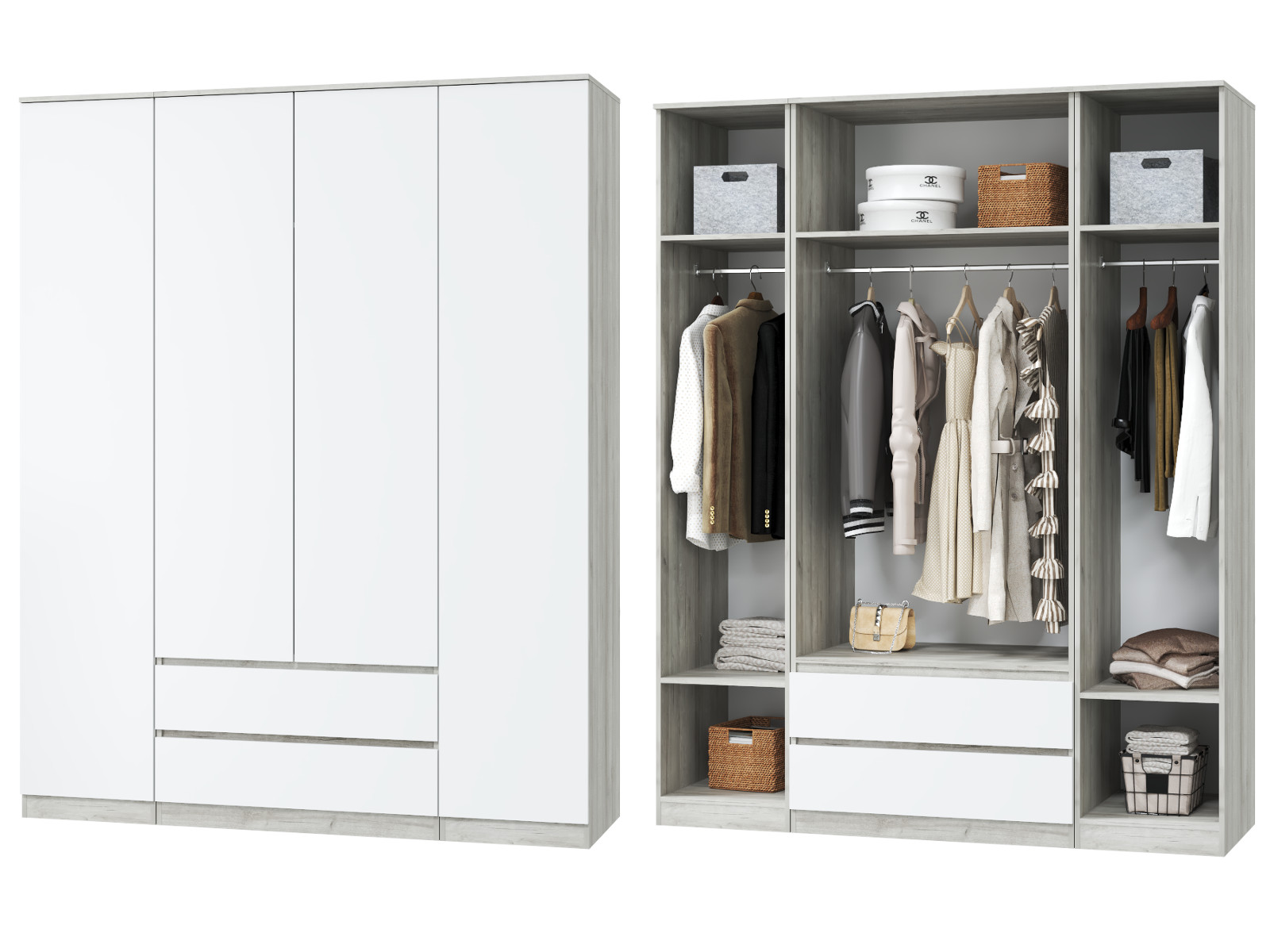 - Шкаф для одежды четырехдверный Лори дуб серый, белый