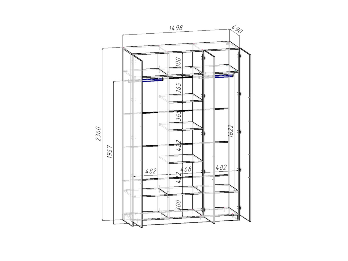 Две оставшиеся секции, габаритами Д.482хВ.2254хГ.490мм., расположены по бокам от центральной и идентичны друг другу. В низу и наверху имеются несъемные полки-вязки, пространство над и под которыми по 300мм. Между полками имеется пространство в 1622мм высотой и 490мм глубиной, в котором расположена овальная металлическая штанга на металлических штангодержателях для одежды. Штанга располагается на высоте 1957мм. от уровня пола, расстояние от штанги до нижней вязки – 1546мм