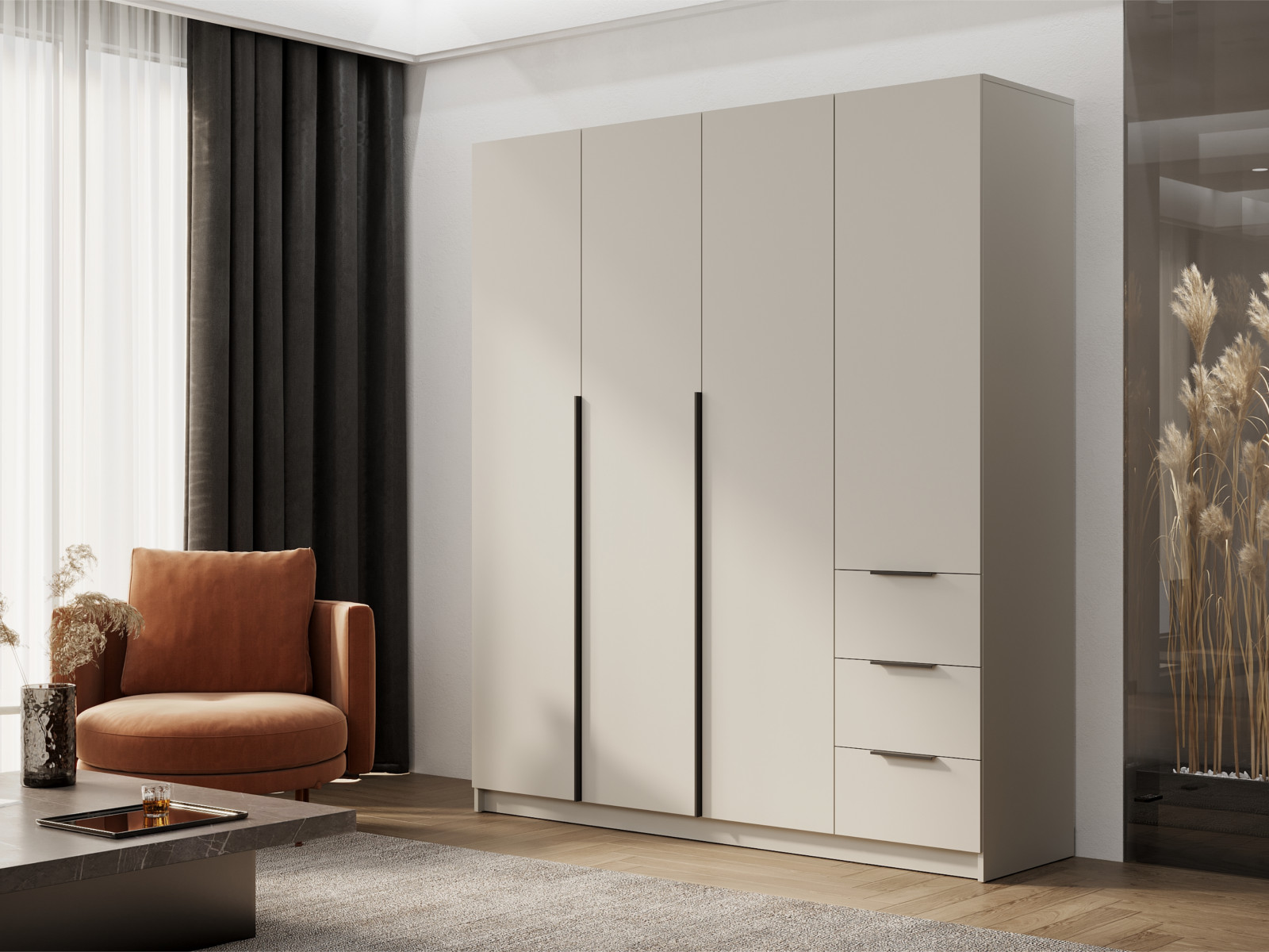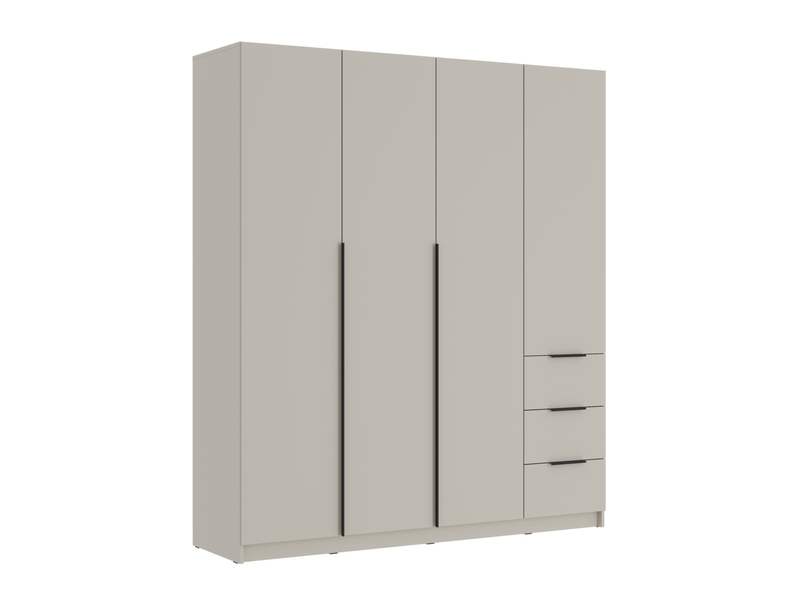 - Две левых створки и фасады ящиков имеют ручку – цвет чёрный, материал – пластик.