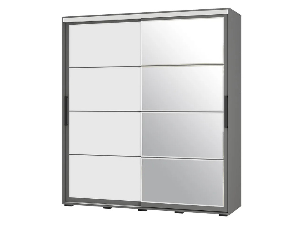 Модель изготовлена из ЛДСП; одна раздвижная створка выполнена из стекла с лакобелью, а вторая – зеркальная, такой прием облегчает конструкцию и позволяет расширить пространство. Внутри шкаф состоит из многочисленных полок и ящиков для белья и одежды, а также отделения со штангой для плечиков.