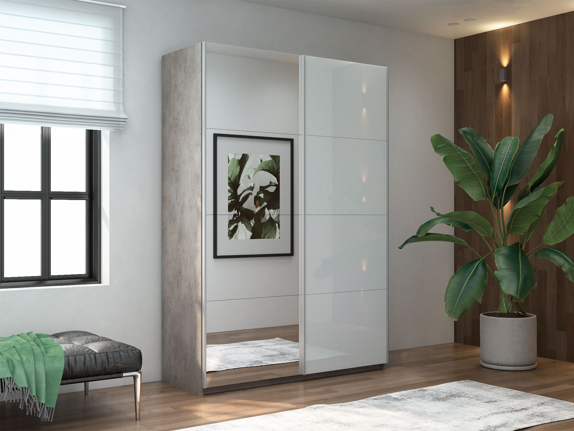 - Шкаф-купе Прайм 2-х дверный 1400 Зеркало/Стекло Белое Бетон