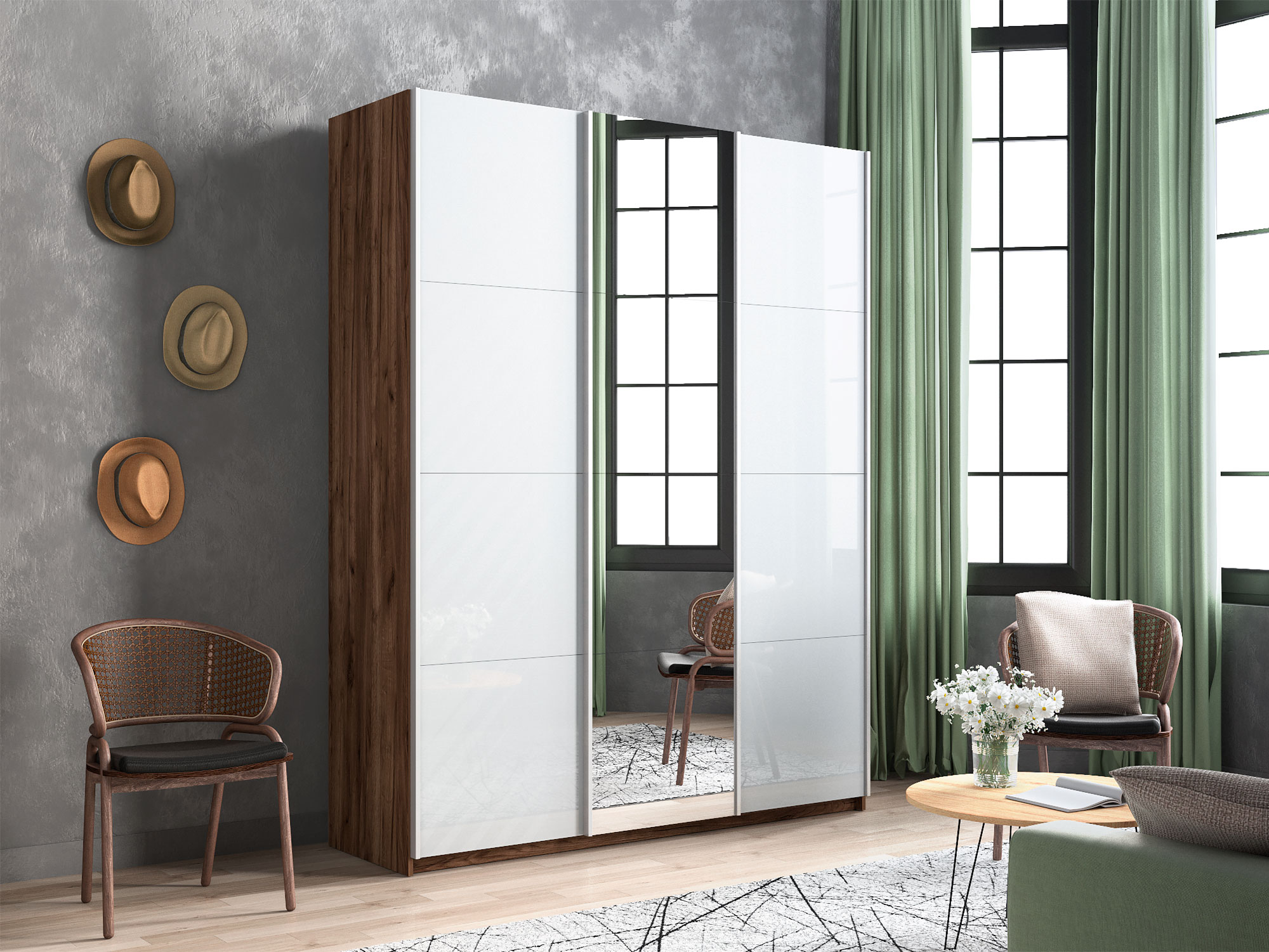 - Шкаф-купе Прайм 3-х дверный 1800 два Стекла Белые/Зеркало Крафт табачный