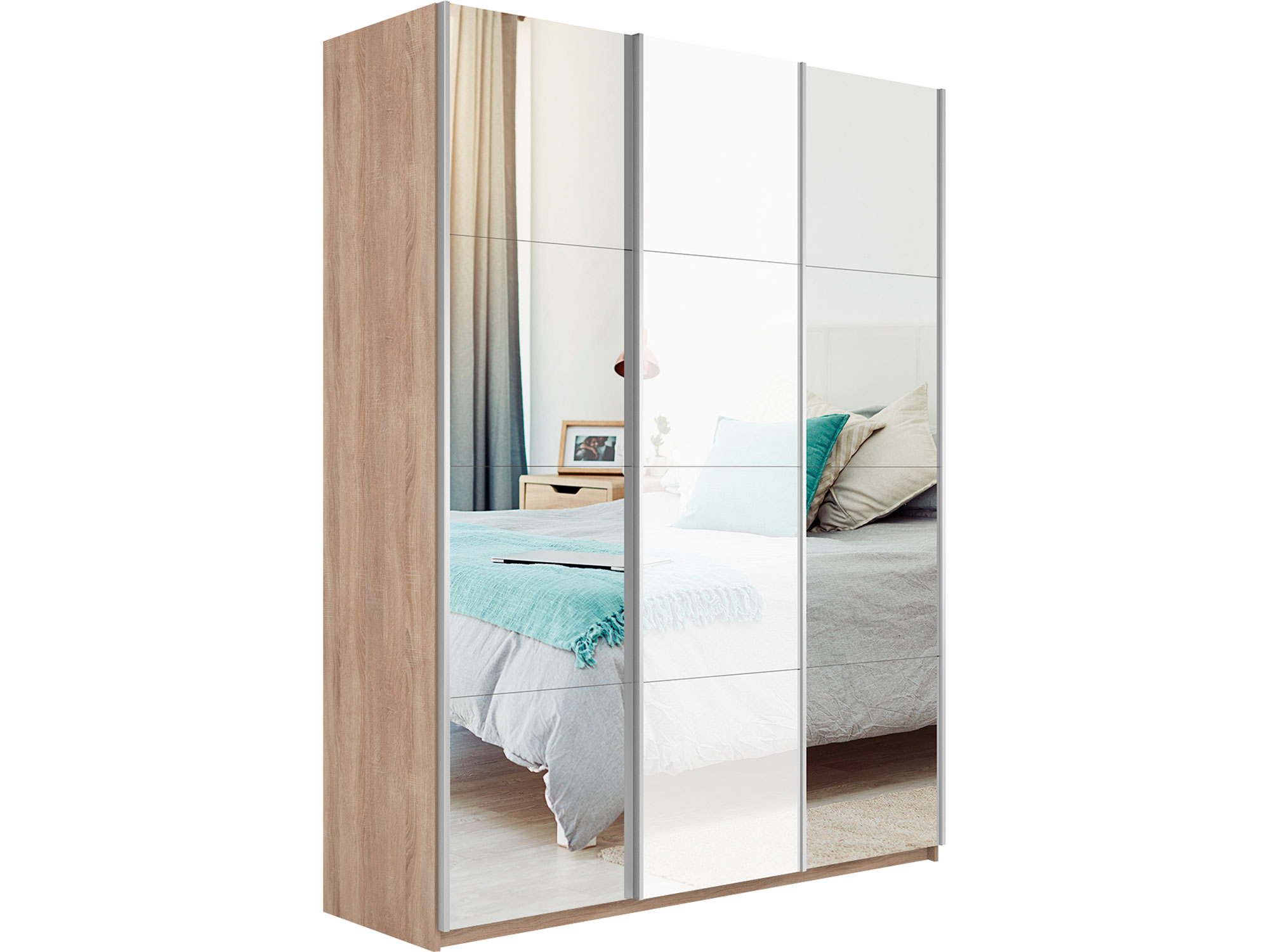 - Шкаф-купе Прайм 3-х дверный 1800 Зеркало/Стекло Белое/Зеркало Сонома