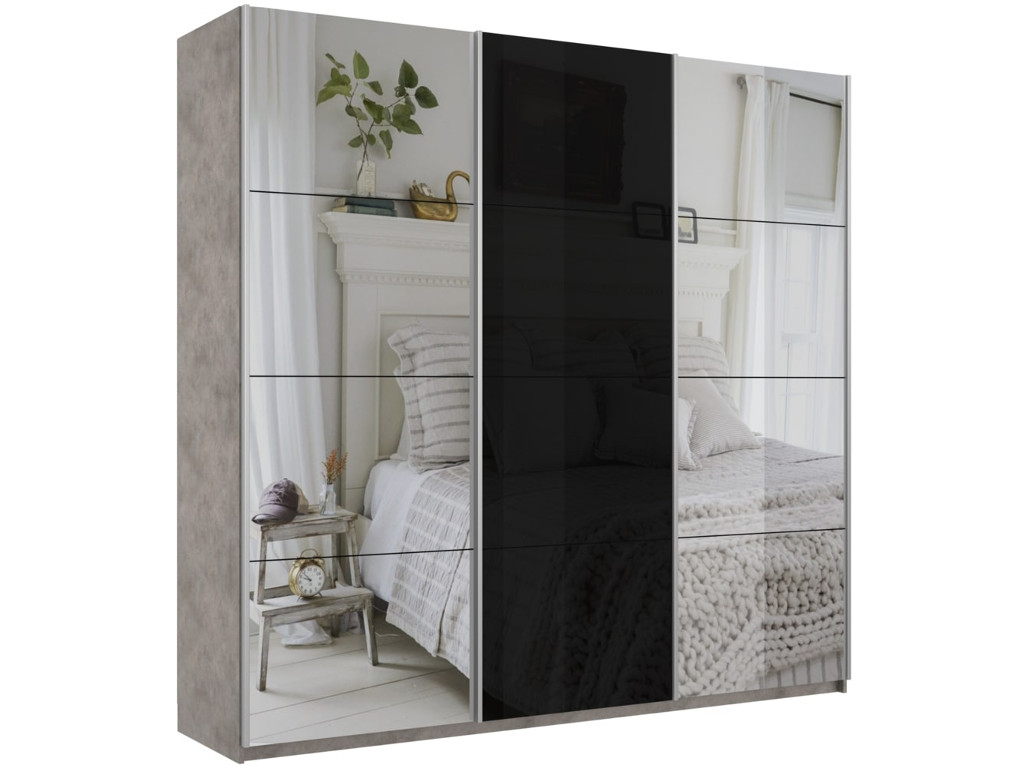- Шкаф-купе Прайм 3-х дверный 1800 Зеркало/Стекло Черное/Зеркало Бетон
