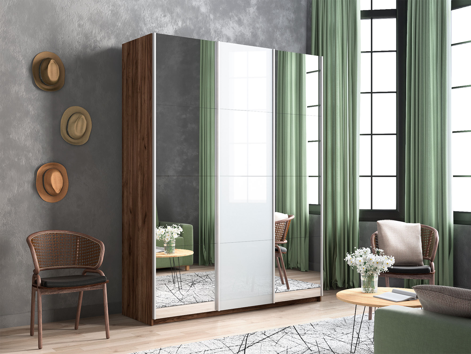 - Шкаф-купе Прайм 3-х дверный 2100 Зеркало/Стекло Белое/Зеркало Крафт табачный