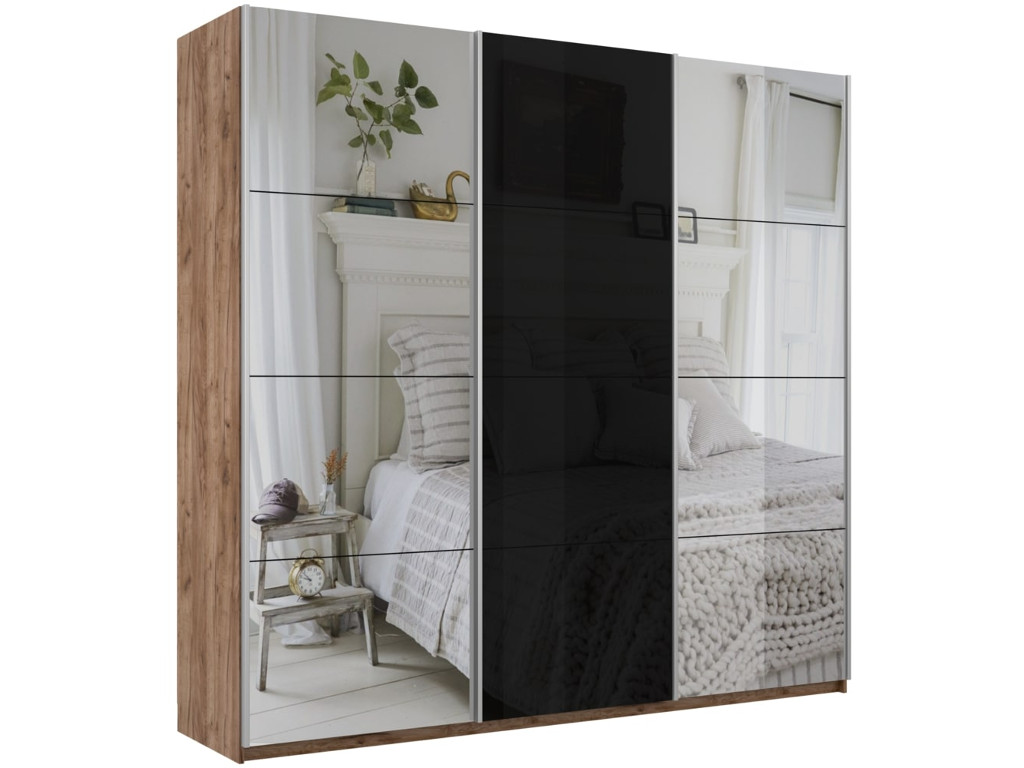 - Шкаф-купе Прайм 3-х дверный 2100 Зеркало/Стекло Черное/Зеркало Крафт табачный