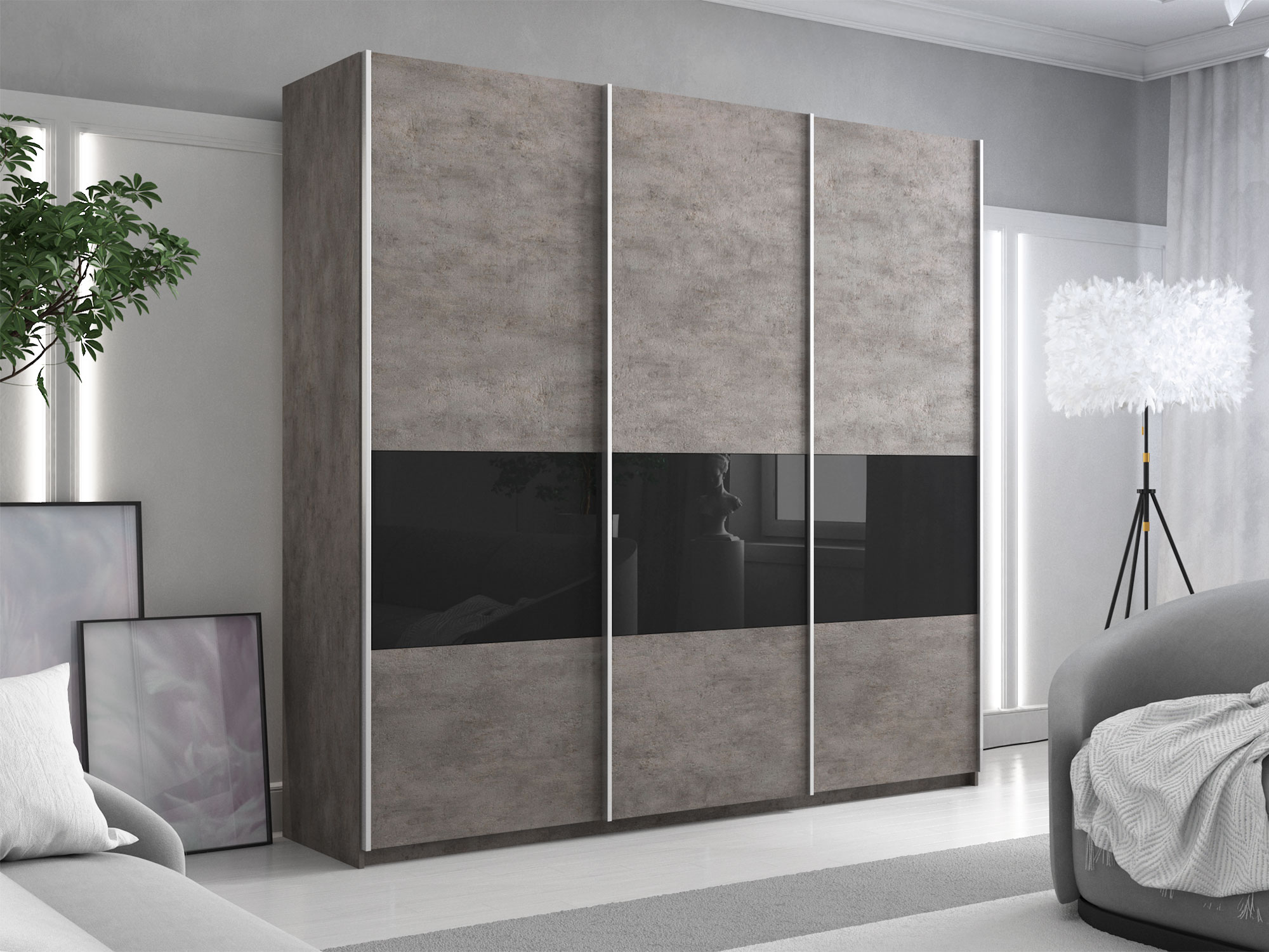 Шкаф-купе Прайм Широкий 3-х дверный ДСП/вставки Стекло Черное Бетон