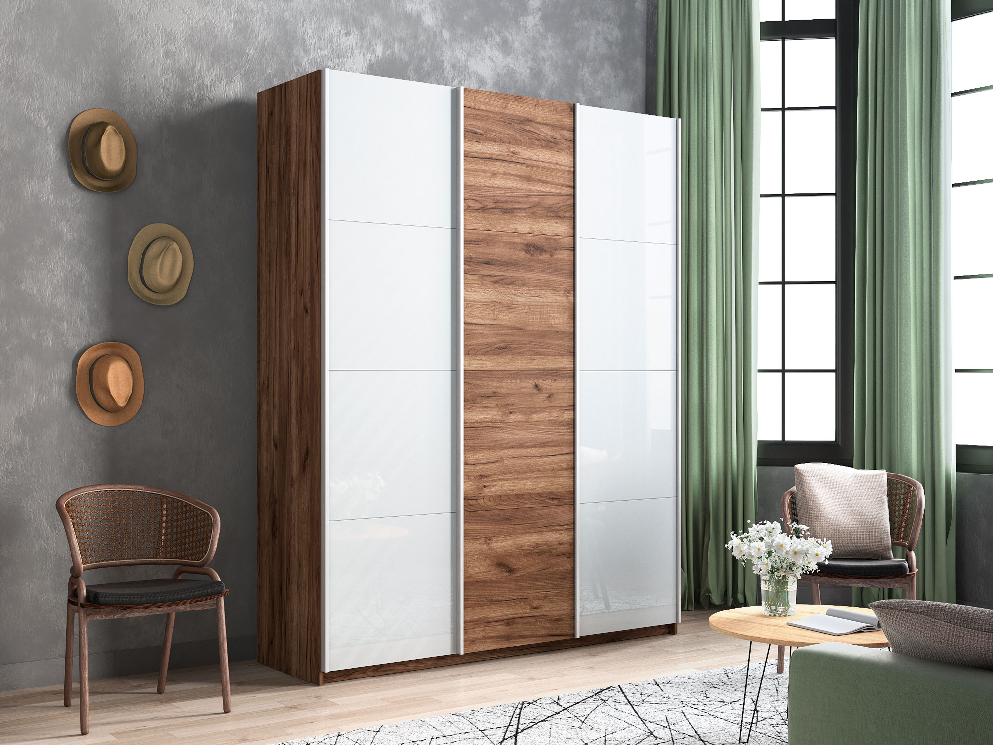 Шкаф-купе Прайм Широкий 3-х дверный два белых стекла/ДСП Крафт табачный