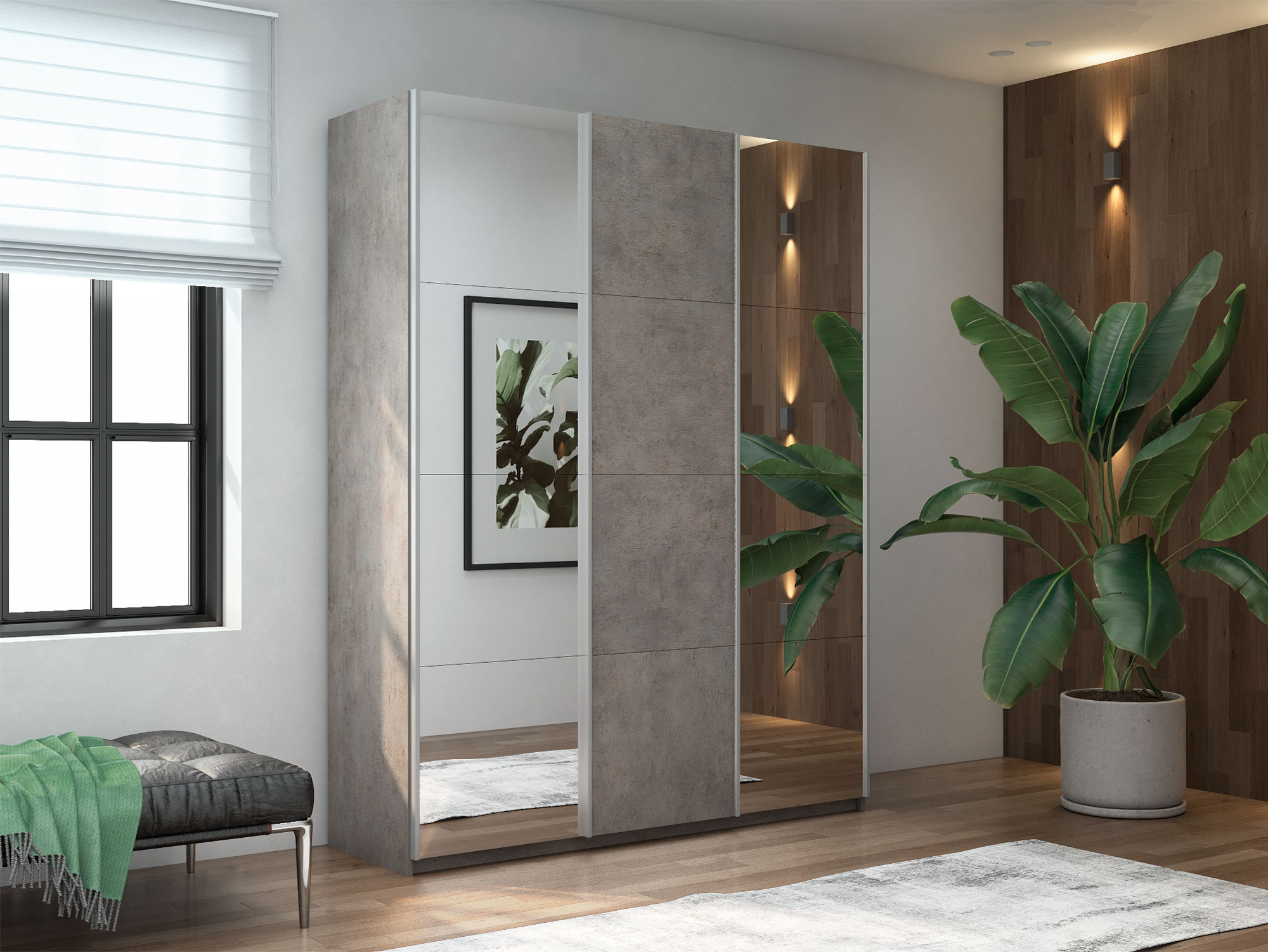 Шкаф-купе Прайм Широкий 3-х дверный два зеркала/ДСП Бетон