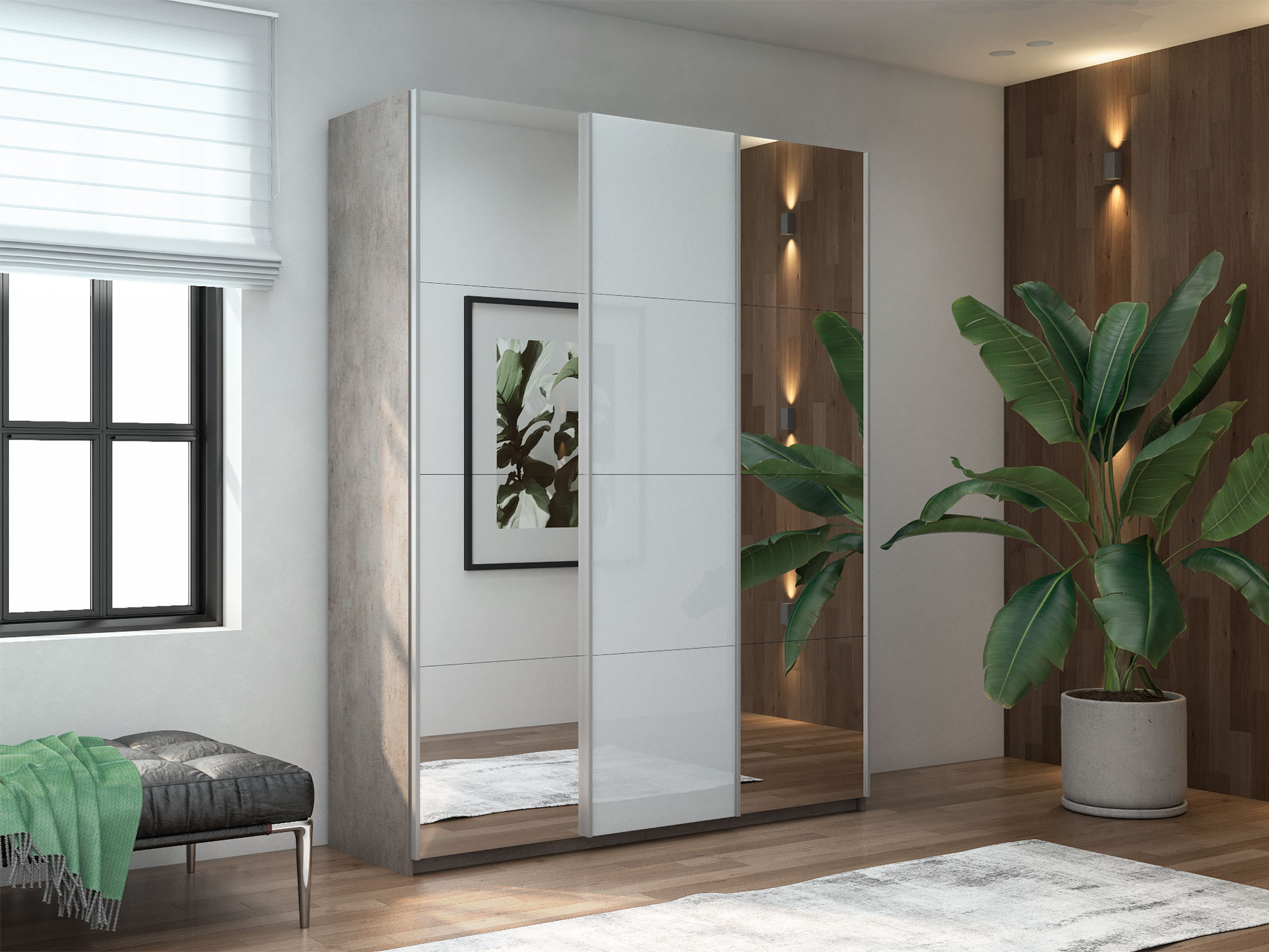 - Шкаф-купе Прайм Широкий 3-х дверный два зеркала/стекло белое Бетон