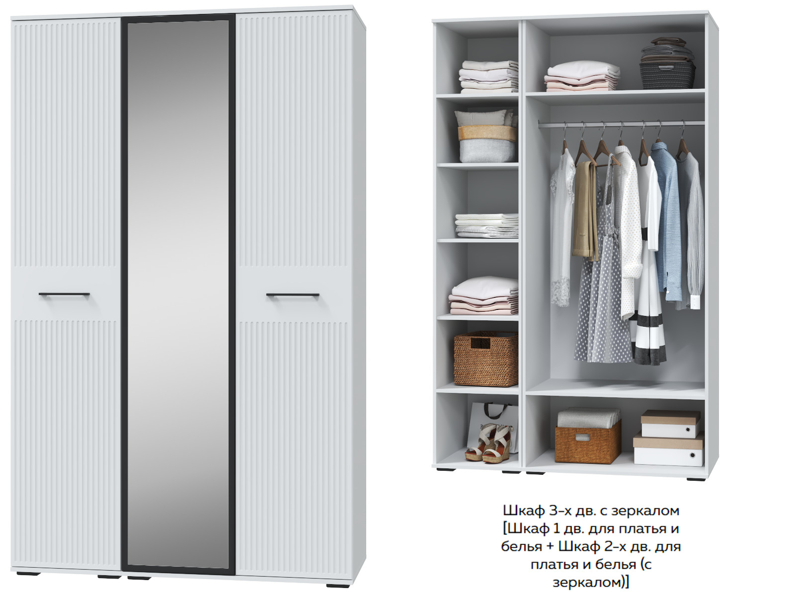 В комплекте: Шкаф 1 дв. для платья и белья + Шкаф 2-х дв. для платья и белья (с зеркалом)