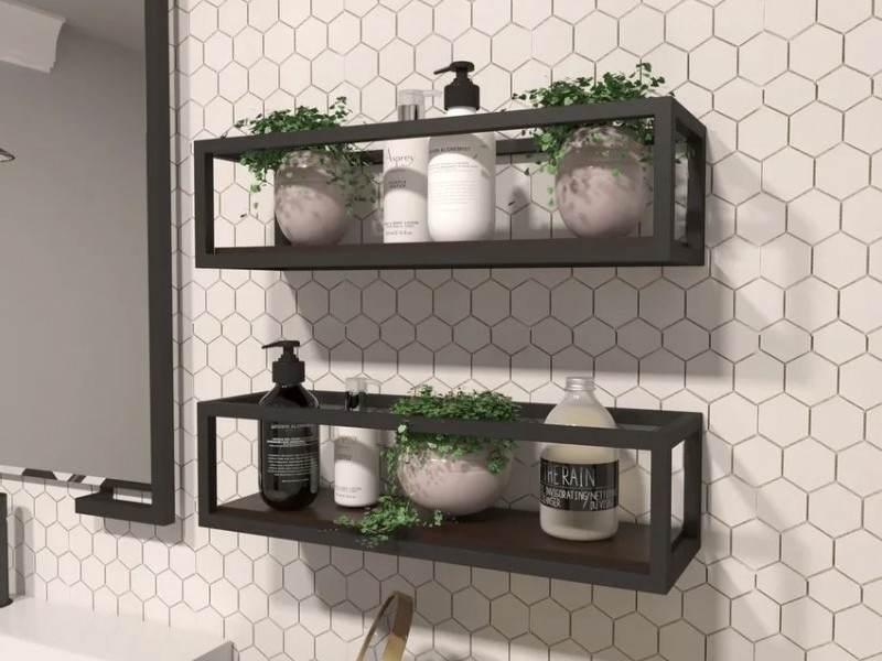 - Открытая полка из металлического профиля с основанием из массива дерева